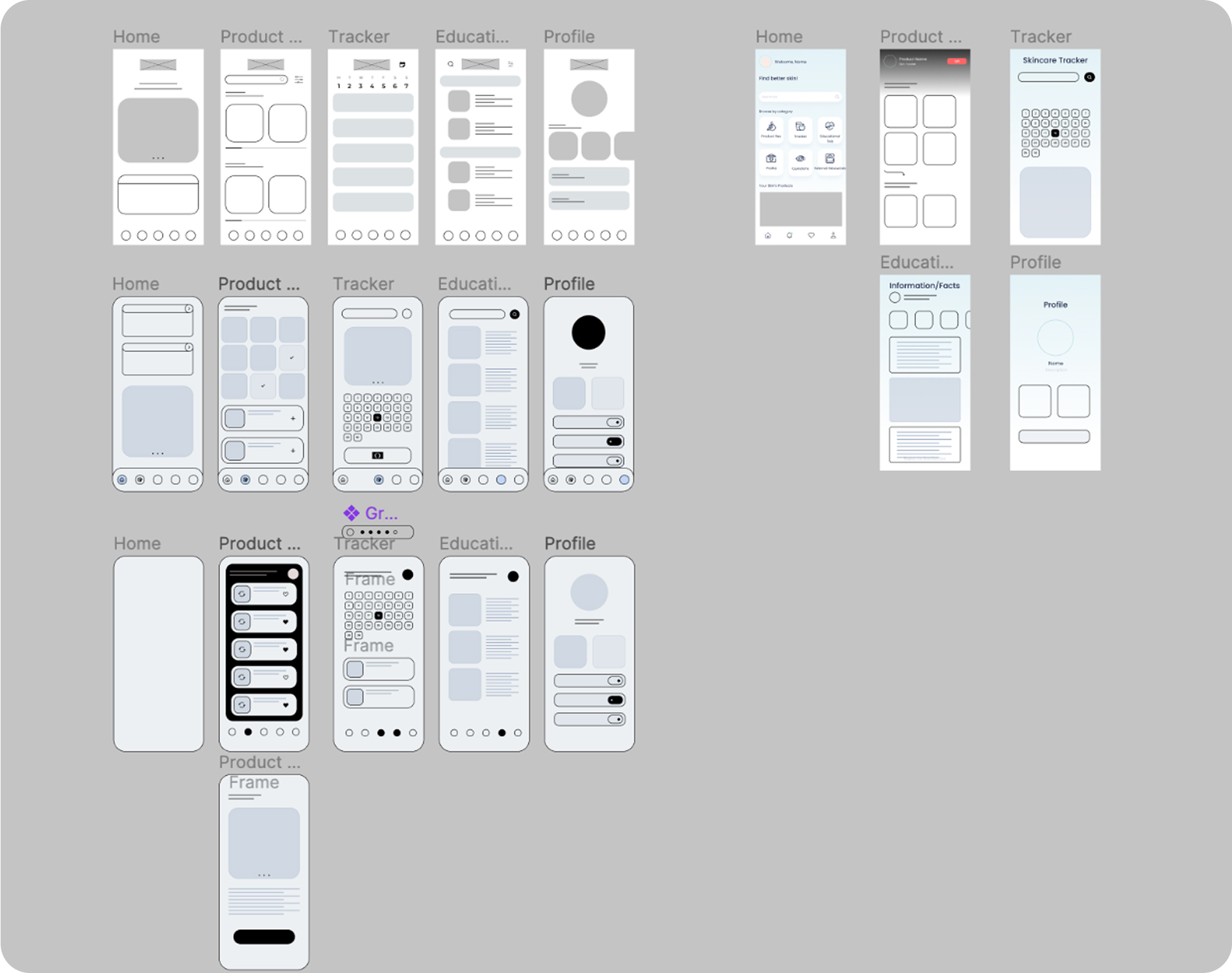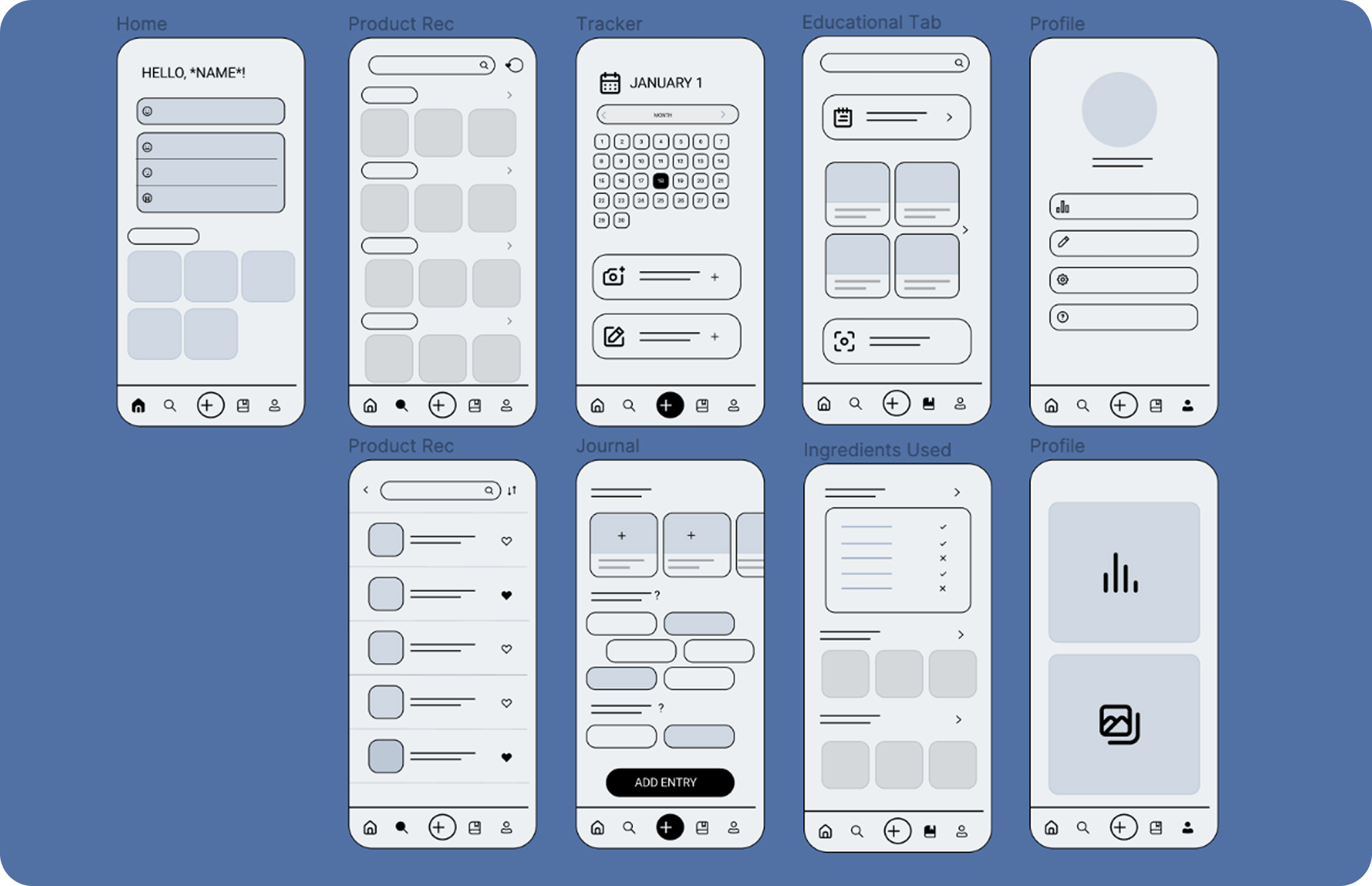 In my first UI/UX project with Design@UCI, we built SkinTrack—a platform for logging skin progress, tracking ingredients, and delivering bite‑sized skincare lessons so users can cut through information overload and personalize their routine.